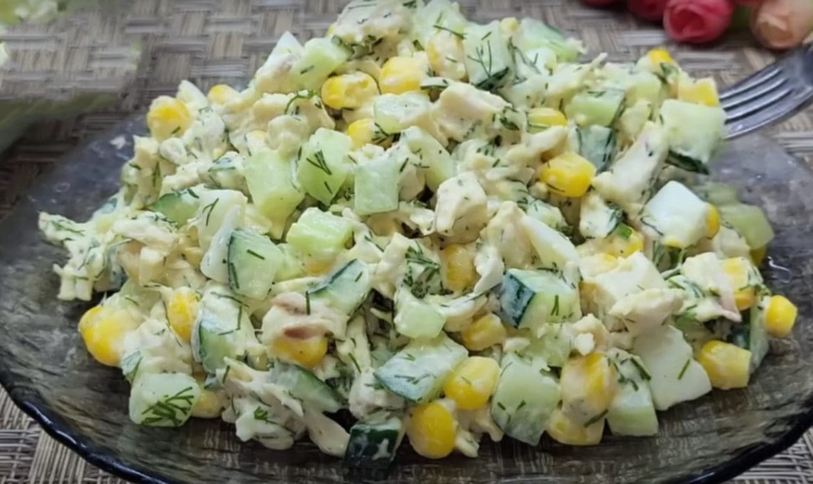 - Kukurūzus iš konservų nusunkite nuo skysčio ir įdėkite į salotas.