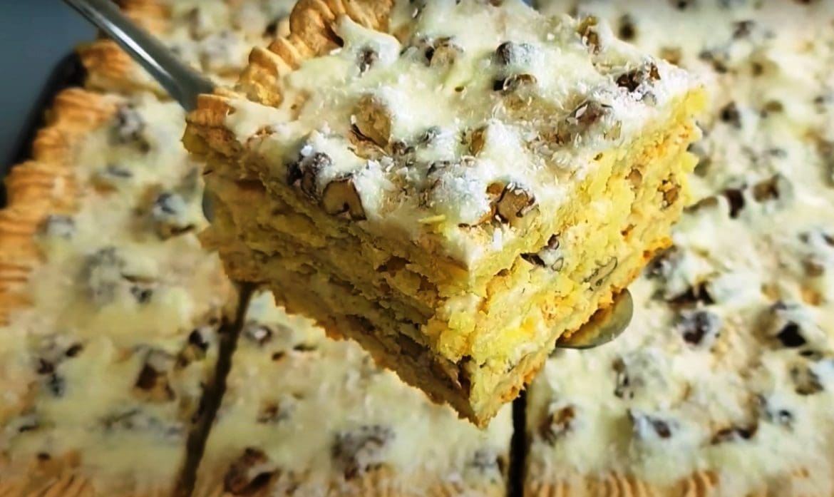 Likusius tešlos sluoksnius taip pat sutvarkykite tokia tvarka: sutarkuokite, sluoksniuokite, morenguokite ir pabarstykite riešutais. Vėl kaitinkite tol, kol jie įgaus pageidaujamą tekstūrą.