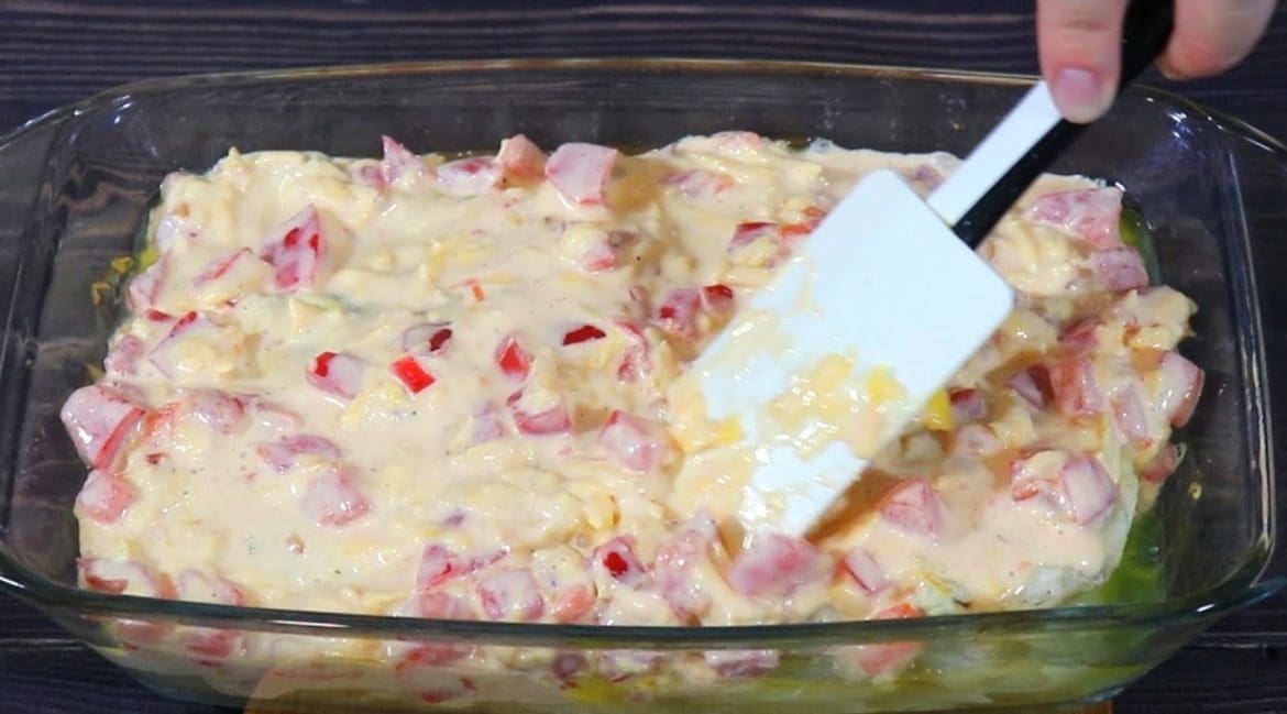 Sūrio, kiaušinio ir prieskonių mišinys: Sumaišykite pomidorą su tarkuotu sūriu, kiaušiniu, smulkintomis žolelėmis, druska ir pipirais. Šis mišinys bus viršutinis sluoksnis, kuris suteiks apkepui auksinį įspūdį ir skonį.