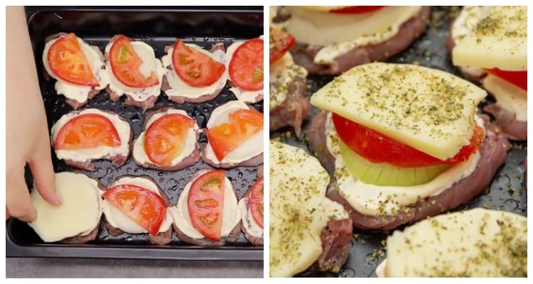 Visi ingredientai paruošti, pradėkime rinkti patiekalą. Mėsos gabaliukus patepkite majonezu. Tada ant kiaulienos aptepame svogūnų žiedus. Ant svogūnų sudėkite pomidorus. Sūriu aptepkite pomidorus. Ir ant viršaus pabarstykite sūrį sausais mairūnais. Prieskonius galima keisti ir derinti pagal savo skonį. Taip pat puikiai tiks džiovintas bazilikas ir raudonėlis.