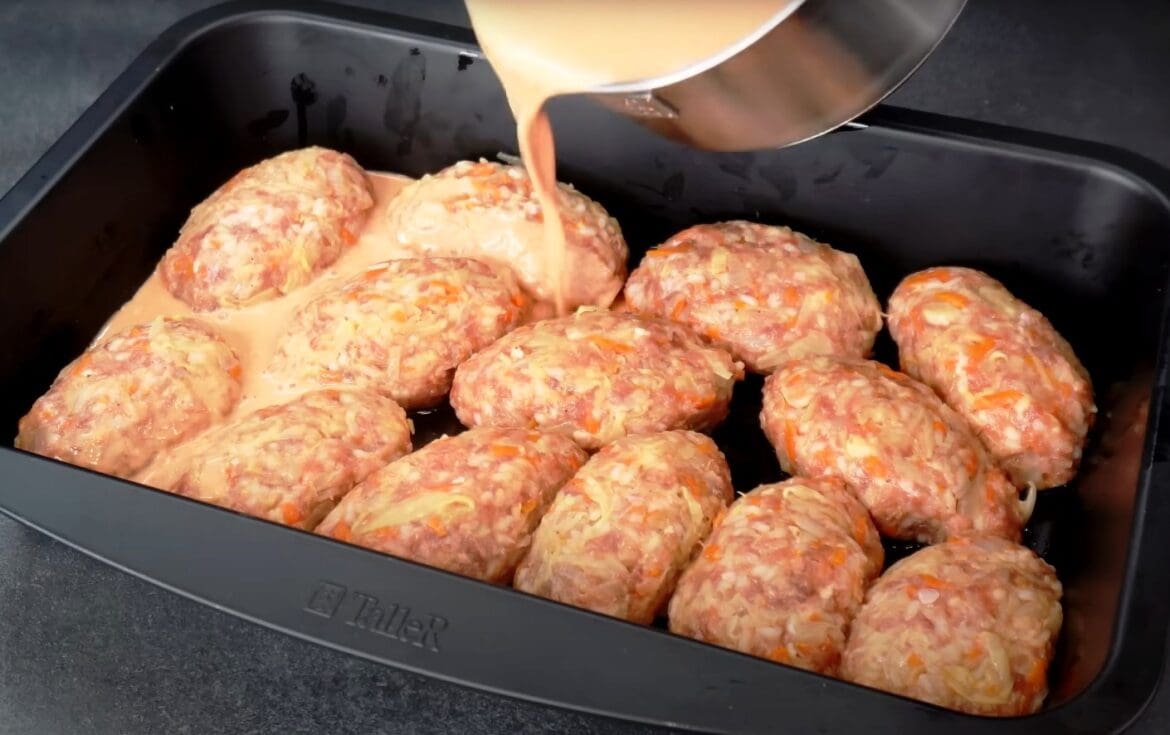 Sudėkite kukulius į kepimo indą ir užpilkite paruoštu padažu. Kepkite 180 °C temperatūroje apie 50 minučių.