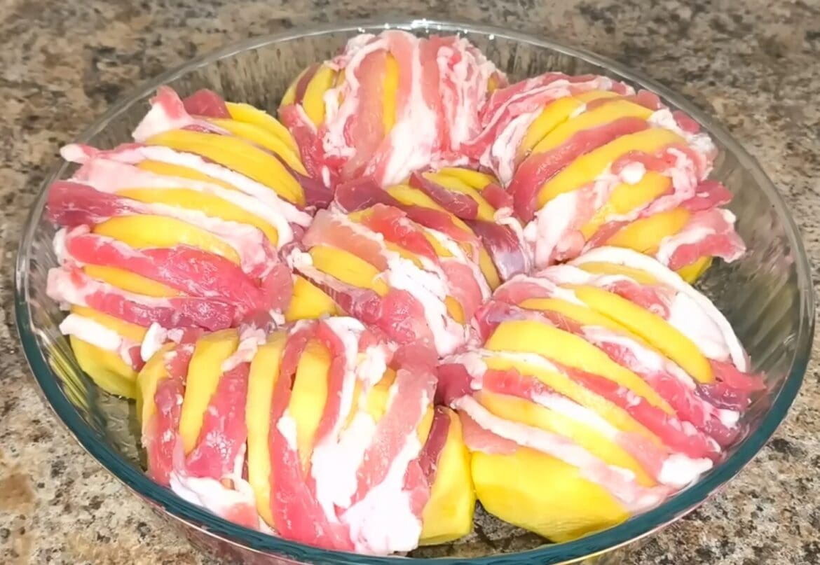 Kiekvieną griežinėlį įdėkite į bulvių įpjovimus – geriausia riebaline puse į vidų.