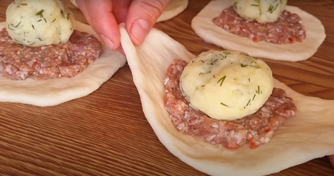 Iš tešlos iškočiojame nedidelius plokščius paplotėlius, į kuriuos dedame faršo kotletą. Ant kiekvieno kotleto uždėkite po bulvių rutulį.