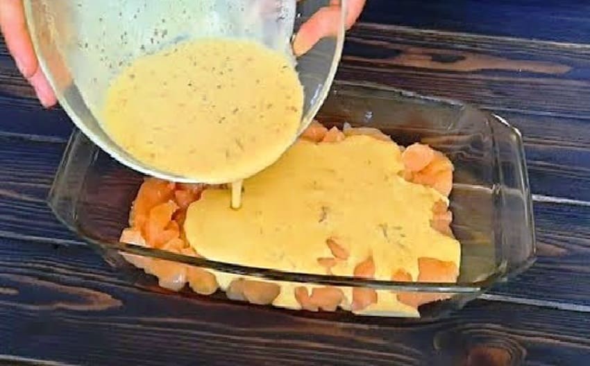 Troškinio formavimas: Imkite kepimo indą ir sudėkite mėsą į jį. Ant viršaus užpilkite kiaušinių ir grietinės mišinį. Viską gerai išmaišykite, kad mėsos gabaliukai būtų tolygiai aptraukti.