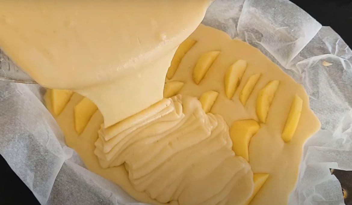 Užpilkite likusia tešla taip, kad obuoliai būtų tolygiai padengti.