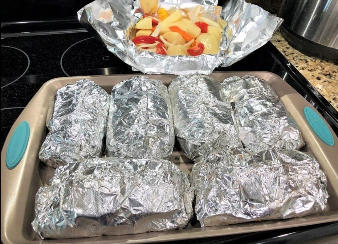Paimkite foliją ir supjaustykite gabalėliais – kiekis priklauso nuo to, kiek patiekalo porcijų gaminsite svečiams. Ant kiekvieno folijos gabalėlio dėkite po porą šonkauliukų, keletą bulvių griežinėlių, pomidorų ir saldžiosios paprikos griežinėlius. Uždarykite foliją, kad viskas gerai išsilaikytų, ir visas porcijas perkelkite į kepimo skardą.