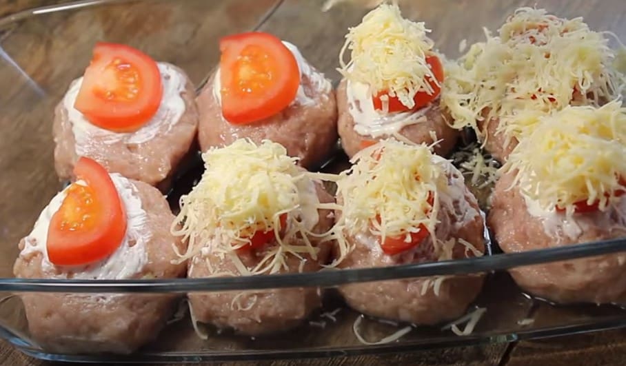 Pomidorus supjaustykite riekelėmis ir dėkite ant kotletų. Ant viršaus pabarstykite tarkuotu sūriu. Sūris puikiai ištirpsta kepimo proceso metu ir suteikia kotletams ne tik puikų skonį, bet ir malonią tekstūrą.