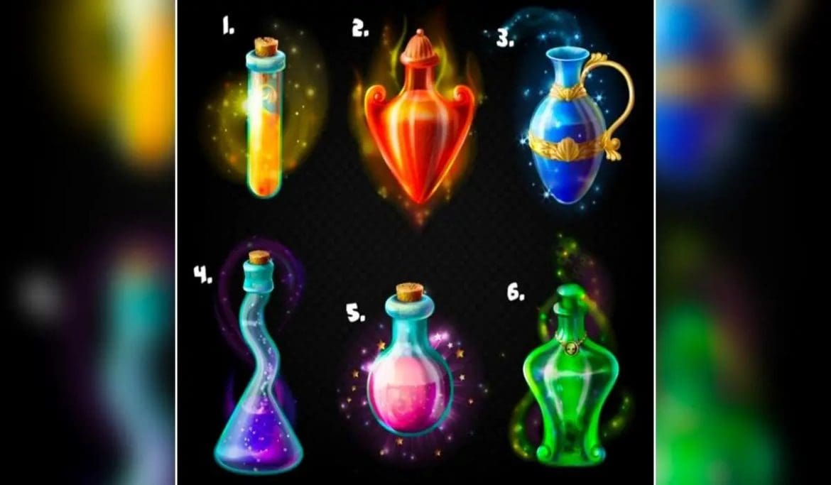 Žemiau rasite paveikslėlį su šešiais skirtingais eliksyrais. Kiekvienas eliksyras simbolizuoja skirtingus meilės santykius. Atidžiai apmąstykite, kuris iš jų jums labiausiai patinka, ir pasirinkite eliksyrą, kuris jus traukia. Jūsų pasirinkimas atskleis, kokie santykiai gali ateiti į jūsų gyvenimą.