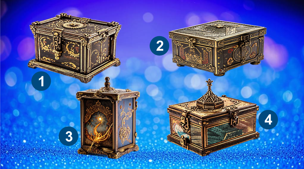 Prieš jus yra keturios išskirtinės dėžutės, kurių kiekviena simbolizuoja tam tikrą jūsų gyvenimo aspektą. Padarykite pasirinkimą pagal savo pirmąjį įspūdį ir sužinokite, kur jums pasiseks artimiausiu metu. Kiekviena dėžutė atneša tam tikrų pokyčių, kurie gali turėti didelės įtakos jūsų gyvenimui. Pasikliaukite savo intuicija ir leiskite pasirinktai dėžutei pasakyti, kurią jūsų gyvenimo sritį paveiks sėkmė.